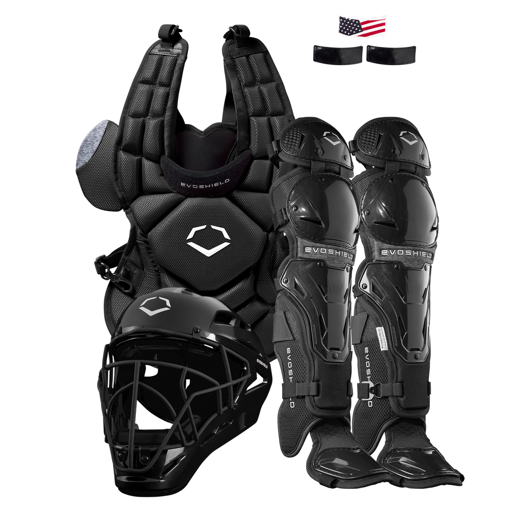 Playing backstop is serious business. That's why the EvoShield Fastpitch Catcher's Gear Kit equips you with head-to-toe protection to stay safe all season. Made for fastpitch players of every skill level, this kit includes our Pro-SRZ Solid Catcher's Helmet, Pro-SRZ Catcher's Upper and Lower Leg Guards and Chest Protector. Made for confidence in front of the ball, it is the first-ever fastpitch chest protector that's engineered to meet the Commotio Cordis test standard required for heart protection in baseball. Our catcher's helmet features a padding system with moisture-wicking fabric to optimize comfort and a steel facemask designed to keep your eye on the ball. The chest protector comes with two extra pieces of black hook-and-loop fabric that you can embroider for a customized look and a third piece of hook-and-loop fabric that features a USA flag. The two-piece leg guard system can be adjusted up or down by two inches, and the lower leg guards are made of our Gel-to-Shell® Technology that molds to you like a glove and disperses impact energy.