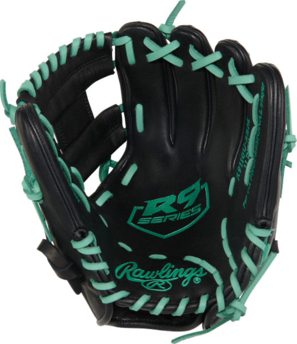 The Rawlings R9 11-Inch Youth Glove is built specifically for young athletes developing their infield skills. Featuring Contour Fit technology and a smaller hand opening, this glove fits tighter and closes easier for more confident fielding. Its Pro I™ Web and 110U Pattern offer great visibility and control in the pocket, while the Black/Mint color scheme adds energy to every play. With a game-ready leather shell, this glove is ready to go from day one.