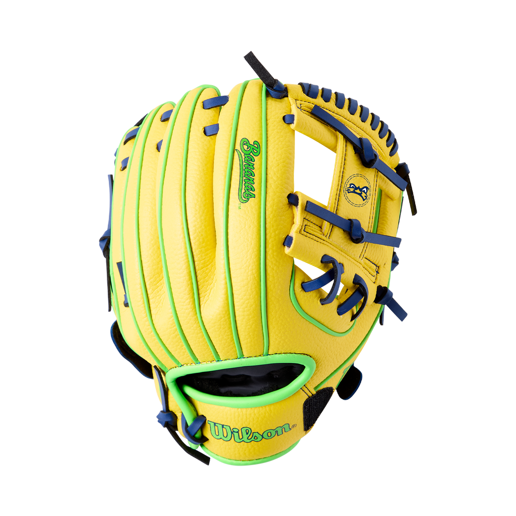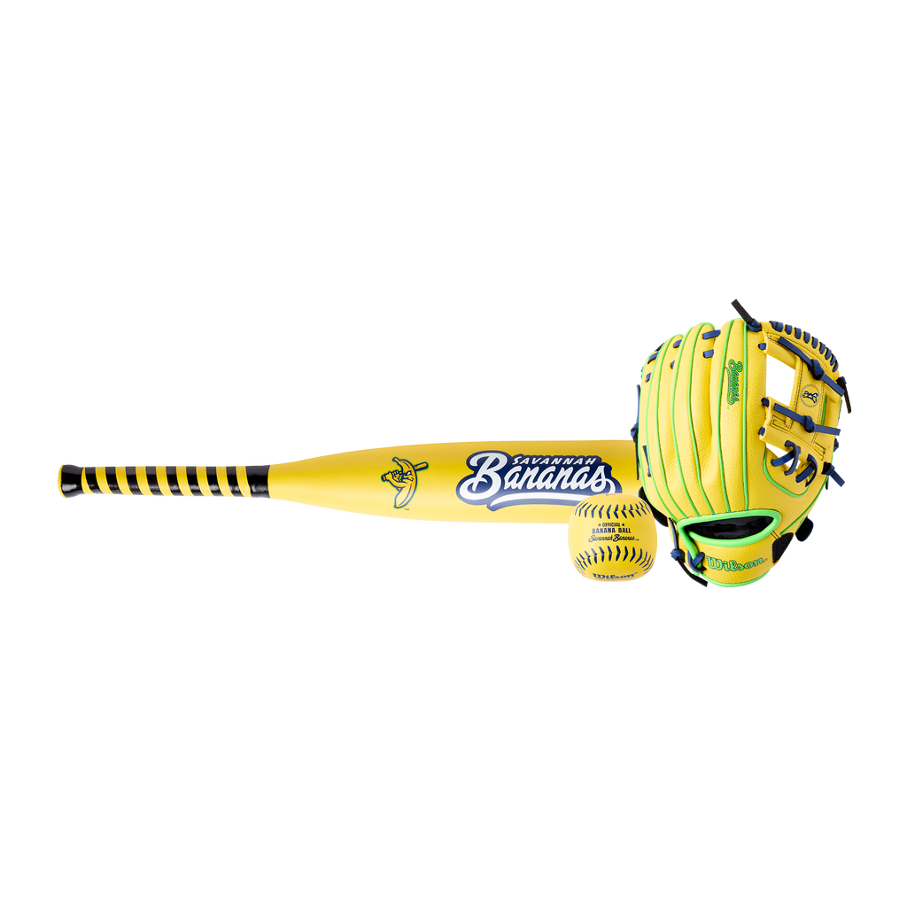 A bundle of fun, all in one. This glove, ball and bat kit includes an A200™ EZ Catch™ Savannah Bananas 10” T-Ball Glove, along with a cotton-stuffed ball and foam bat.