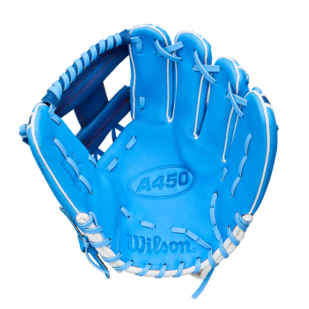 The 2026 Wilson A450® 11.5” Youth Baseball Glove is designed to help young athletes sharpen their skills with confidence. Crafted with soft, durable top grain leather, this glove offers a lightweight, game-ready feel right out of the box. Its 11.5” size and H-Web design make it versatile across the field, giving players the control and reliability they need in any position. The Quick Fit Wrist system uses an elastic band to create a snug, secure fit for smaller hands, while Wilson’s Rolled Dual Welting™ reinforces the glove’s structure, helping it keep its shape season after season. Finished in a bold Cool Blue, Royal Blue, and White colorway, the A450® delivers pro-level design elements with youth-specific comfort and fit.